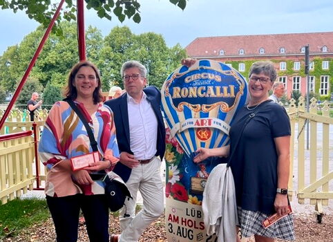 Und es gab einen Einblick in das Marketing von Roncalli, den uns Mathijs Te Kiefte gewährte. Er verantwortet die Leitung des Toureebüros und hat den Überblick über alle Aktivitäten vor Ort - für das Marketing, aber auch andere Themen die organisiert werden wollen. Zum Beispiel hat Roncalli inzwischen 6 Zelte, welche bereits in der nächsten Tournee-Stadt aufgebaut werden können, während die Vorstellungen noch am aktuellen Standort laufen. Nur die Technik gibt es nicht mehrfach, Licht, Ton usw. müssen schnell abgebaut werden und nachreisen - mit dem Zug, wie alles andere auch. Ein wichtiger Marketing-Faktor für Roncalli sind auf jeden Fall die Standorte in den jeweiligen Städten, so wie in Lübeck der Holstentorplatz. Roncalli möchte da präsent sein, wo das Stadtleben stattfindet und man mitten drin ist. Das bedeutet für Lübeck zum Beispiel aber auch Maßarbeit beim Aufbau, da wenig Platz rundherum ist. Aber laut Mathijs Te Kiefte lohnt sich das auf jeden Fall und am Standort Holstentorplatz wird nun auch in Lübeck schon lange festgehalten. Übrigens kommen hinterher, wenn Roncalli abgereist ist, die Landschaftsgärtner und bringen die Fläche wieder in Ordnung.